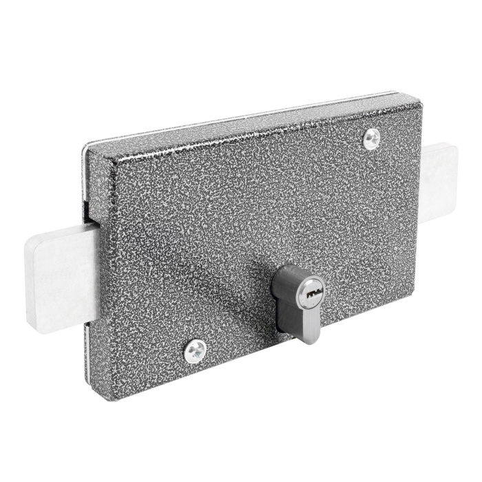 Замок накладной для металлических дверей. Может использоваться для гаражей. Взаимозаменяем с замками ЗГЦ и ЗНЦ производства "Сельмаш" г. Киров Максимальная толщина двери – 50 мм. Комплектация: Корпус замка – 1 шт; Механизм цилиндровый с ключами – 1шт; Накладка наружная – 1 шт. Болт М8 – 4 шт; Гайка М8 – 4 шт; Крышка – 1 шт; Засов – 1 шт; Винт для крепления механизма цилиндрового – 1 шт; Винт для крепления крышки - 2 шт. Инструкция – 1 шт.